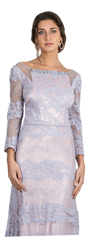 Modelo confeccionado en raso de tono rosa cuarzo con sobre capa de encaje bordado en tono plata azulada.