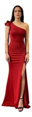Modelo confeccionado en gabardina de lycra para un ajuste perfecto a la figura, diseñado con cuerpo asimétrico y volante en hombro.