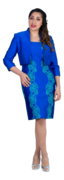 Vestido de manga corta confeccionado en mikado azul klein con delicados detalles en blonda turquesa y azul.