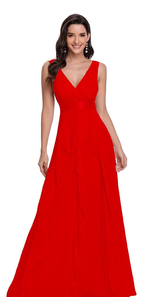 Elegante vestido largo en gasa con fantasía en falda.