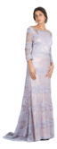 Vestido diseñado con cola y sutiles transparencias de tul en escote y mangas tres cuartos.