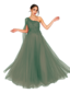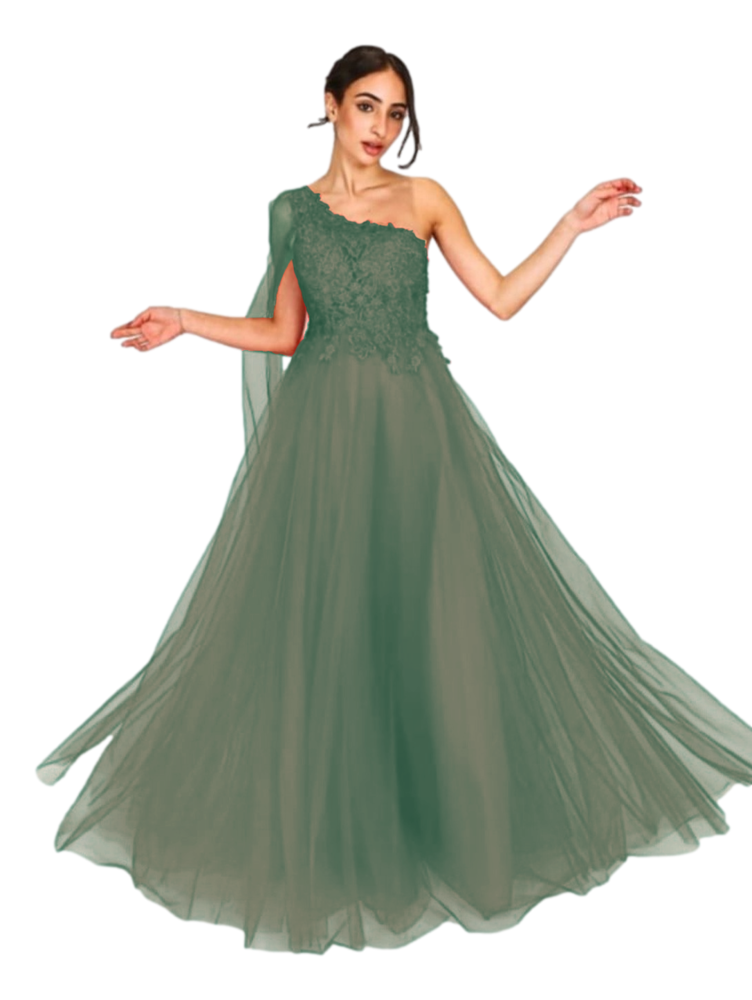 Modelo diseñado en cuerpo asimétrico de cuyo hombro parte fluido velo en suave tul, confeccionado en precioso detalle de guipur inspiración floral con delicadas incrustaciones de pedrería a tono; Espalda igual que delantero y cerrado mediante cremallera invisible lateral.