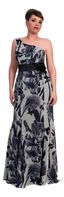 Modelo de estilo griego y corte asimétrico, confeccionado en vaporosa gasa estampada con motivos florales. El diseño del vestido dibuja un solo hombro que se convierte en la espalda en tres finos tirantes atravesados.