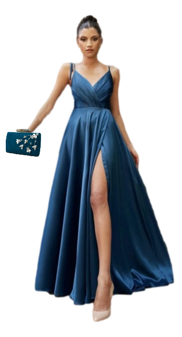 Sofisticado vestido largo satén con abertura en falda y atado en hombro.